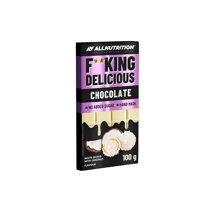 F** King Delicious Chocolate White Choco with Coconut 100G (All Nutrition). Chocolate proteico con leche y coco rallado. Contiene edulcorantes y azúcares naturalmente presentes. Sabor: Chocolate con leche y coco.