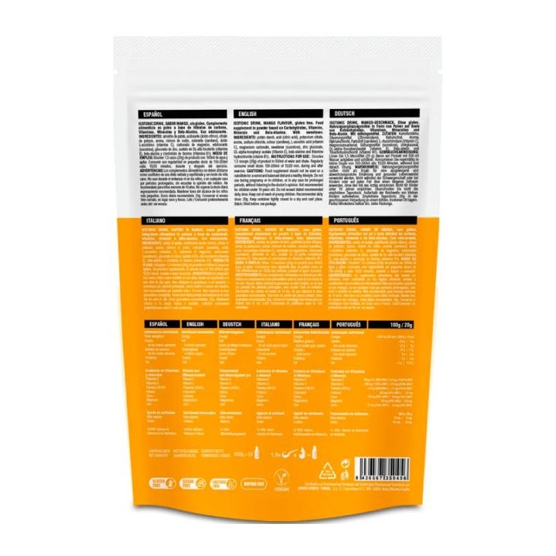 Ingredientes: Amilopectina, acidulante (ácido cítrico), aroma (aroma de limón), citrato de potasio, cloruro de sodio, ácido l-ascórbico, carbonato de magnesio, gluconato de zinc, edulcorante (sucralosa), acetato de d-alfa tocoferilo, beta-alanina, colorante (curcumina) y clorhidrato de tiamina.