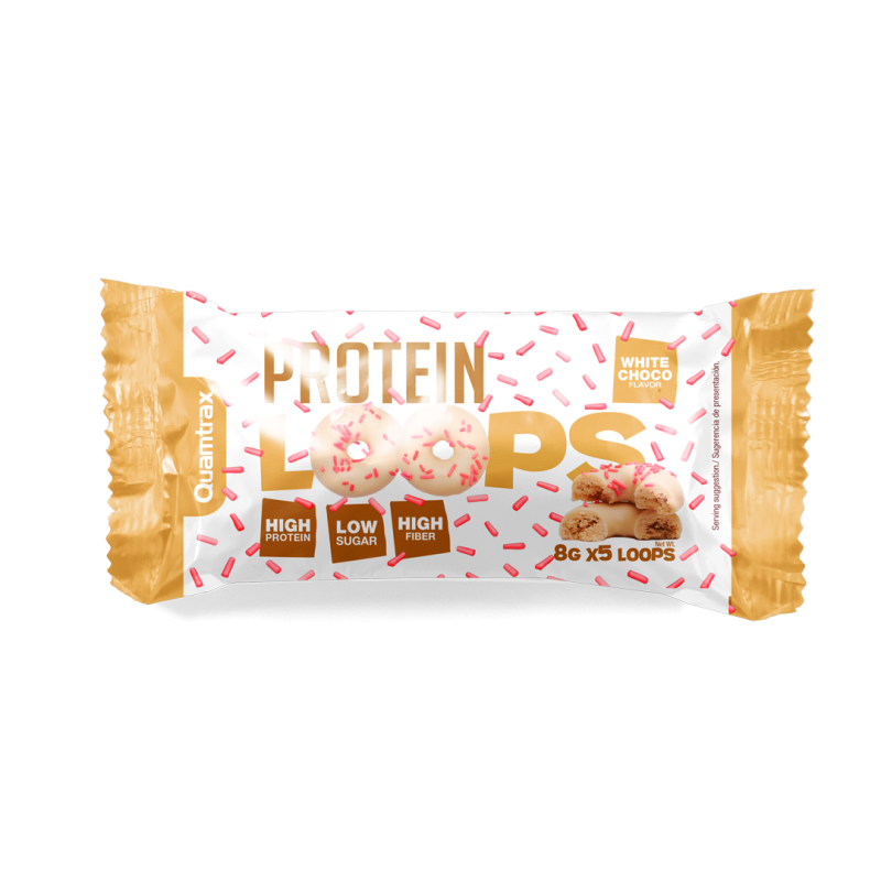 Protein Loops 8GX5 (Quamtrax). Galletas recubiertas de chocolate blanco. Con edulcorante y azúcar. Alto en proteína.