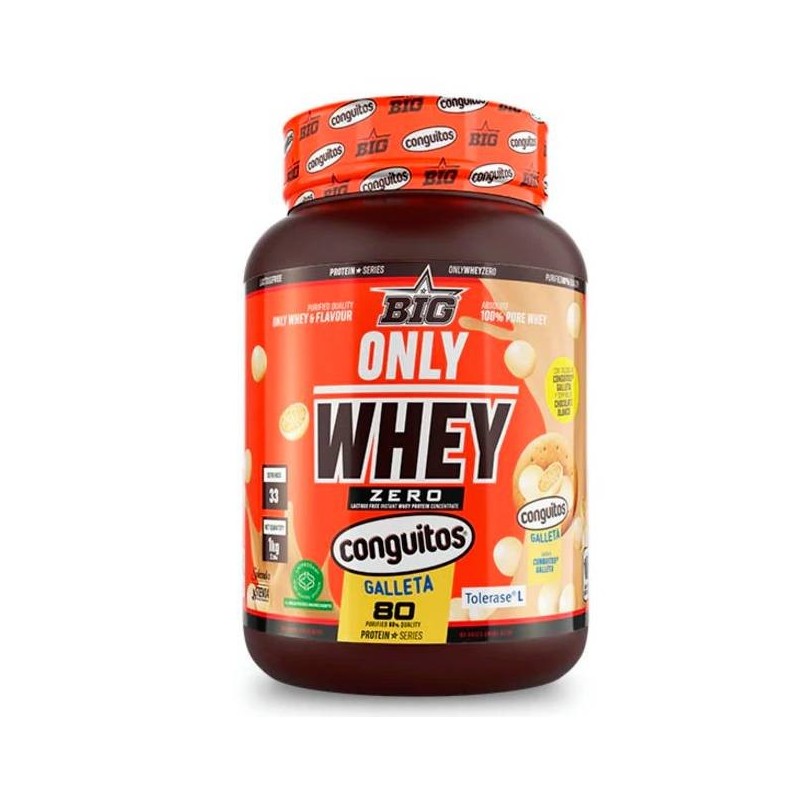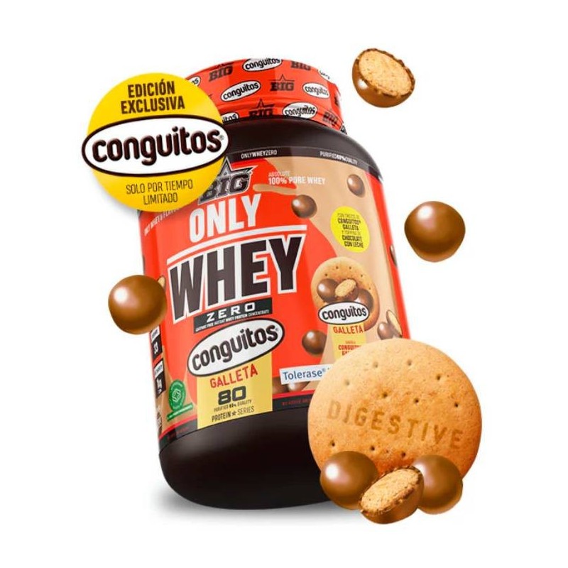 ONLY WHEY ZERO sabor CONGUITOS® GALLETA, la nueva proteína de concentrado de suero sin lactosa de BIG®, elaborada con Lacprodan® SP-8011V Instant, la proteína elegida por las mejores marcas internacionales de suplementación deportiva y uno de los mejores concentrados de suero del mercado, y con la novedosa patente Tolerase L-Lactasa®, una formulación con enzimas de lactasa que mejora significativamente la digestión de la lactosa contenida en el suero. Sin duda, un valor añadido que marca una diferencia para la mayoría de consumidores que busca una proteína en polvo de la más alta calidad.