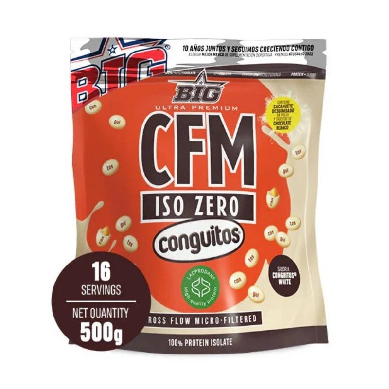Descubre la nueva proteína CFM ISO ZERO CONGUITOS® fruto de una nueva colaboración de BIG® y LACASA®. Disfruta ya del genuíno sabor que te acompañó durante toda tu infancia ¡con polvo de cacahuete desgrasado y trozos de chocolate!, ahora disponible por tiempo limitado en la mejor proteína del mercado en su sabor ORIGINAL y en versión WHITE, con la calidad y seguridad que ofrece el mejor aislado de suero Lacprodan® SP-9225 Instant de Arla® Foods Ingredients.