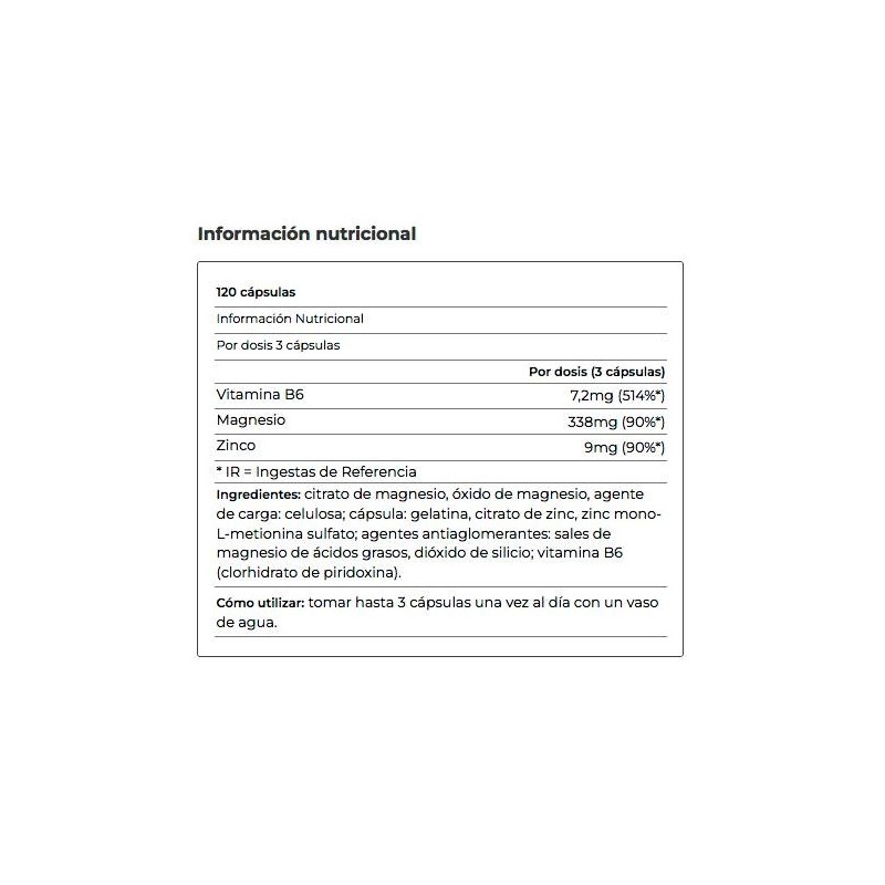 | Ingredientes | citrato de magnesio, óxido de magnesio, agente de carga: celulosa; cápsula: gelatina, citrato de zinc, mono-L-metionina sulfato de zinc; antiaglomerantes: sales magnésicas de ácidos grasos, dióxido de silicio; vitamina B6 (clorhidrato de piridoxina). |